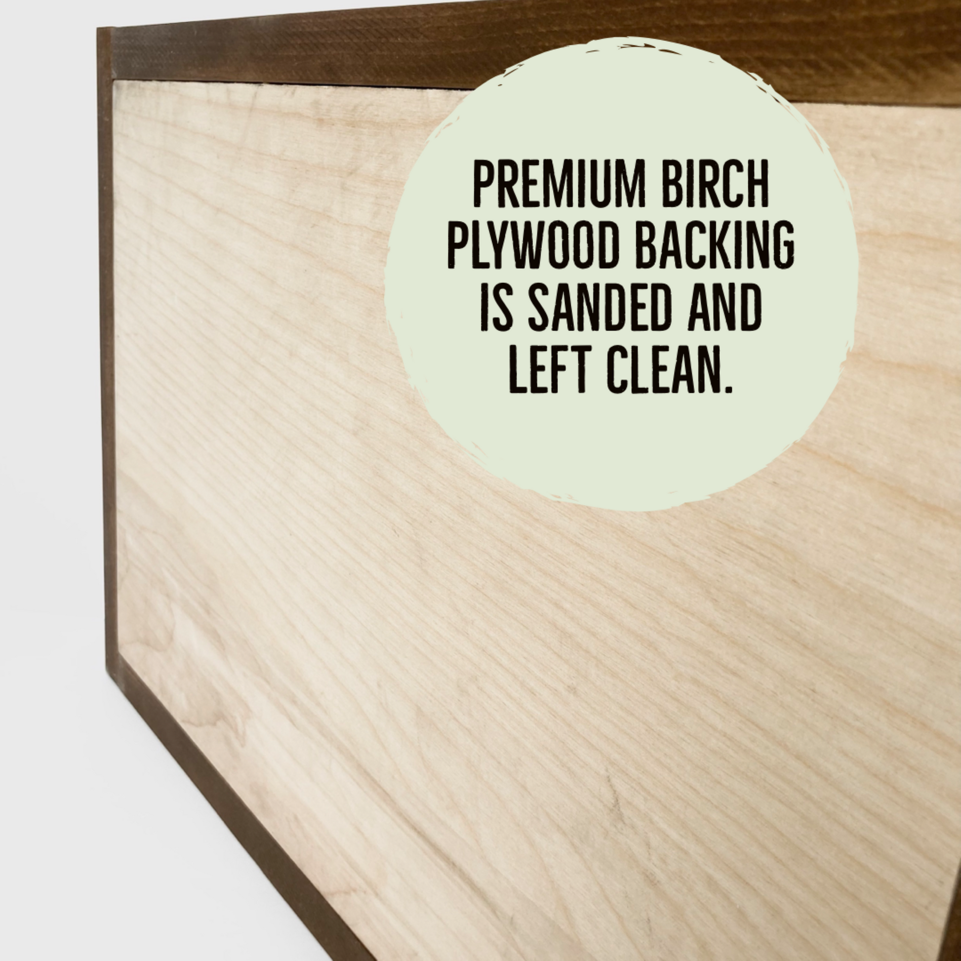 Our wood signs are handmade out of sanded 1/2 inch premium birch plywood and painted. The design is painted. The frame is cut in our shop from 1x2 select pine wood and sanded to ensure a smooth, beautiful finish with your choice of stain. The back of your sign will be sanded and left clean. We finish off your wood sign with a clear coat on both the frame and the sign itself to add a layer of extra protection.