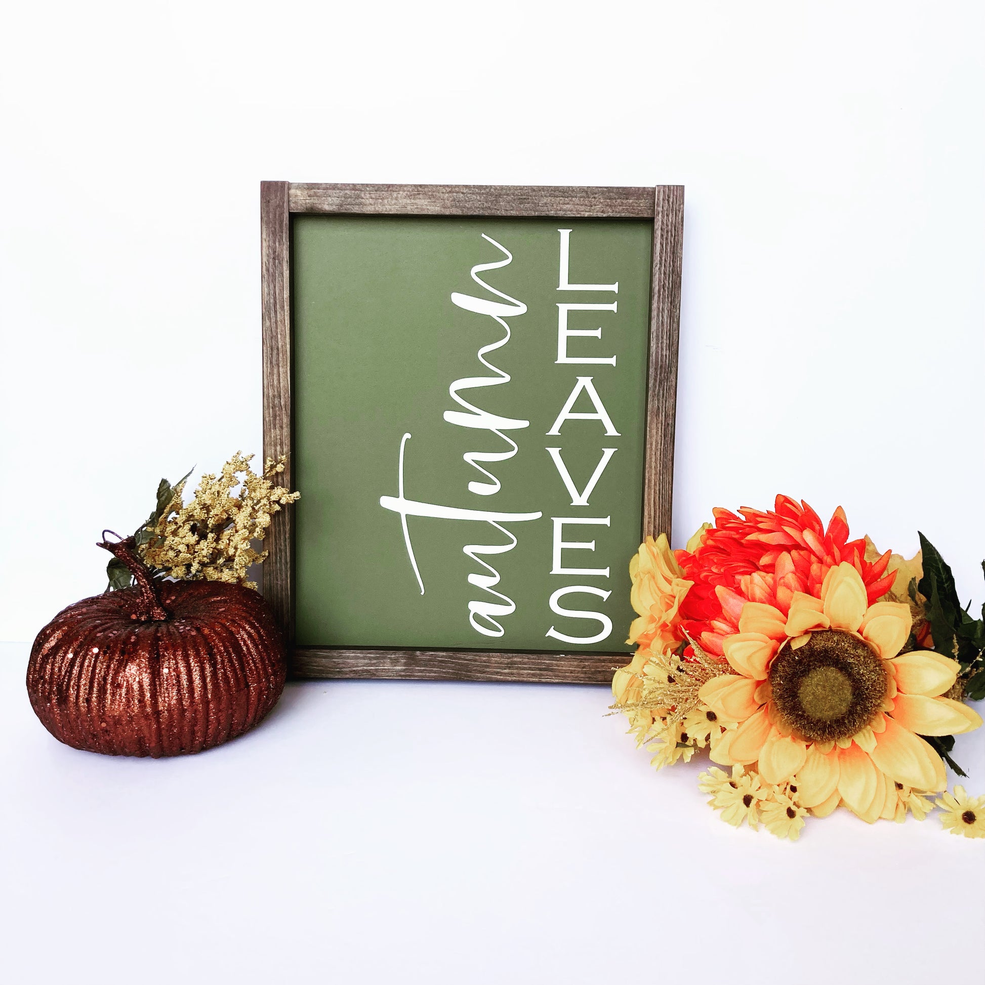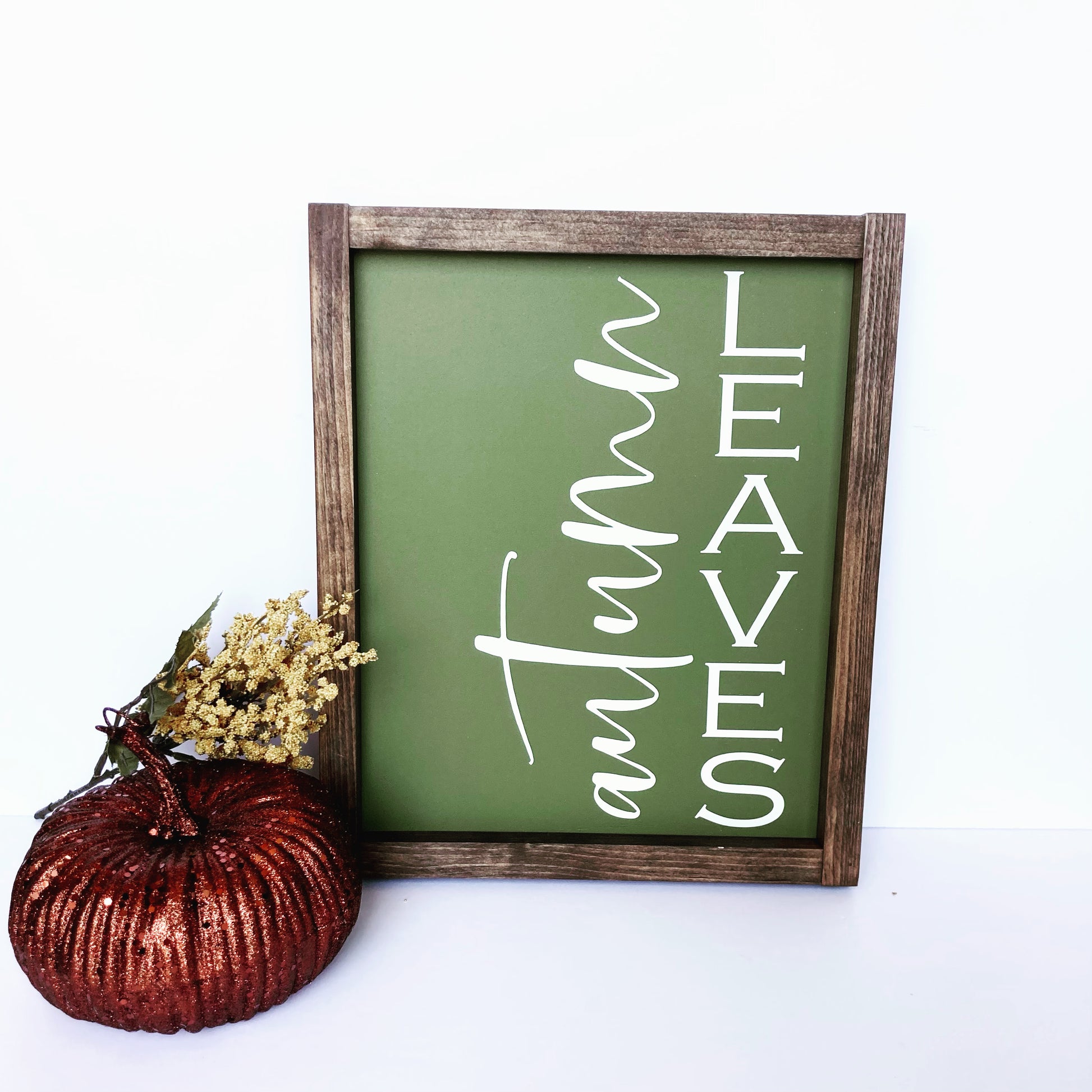 This autumn leaves fall wood sign can be customized with multiple fall color options. It leans beautifully on a shelf, on your kitchen counter, or can be displayed on your wall.