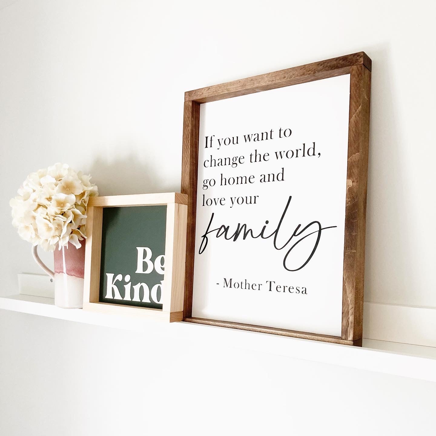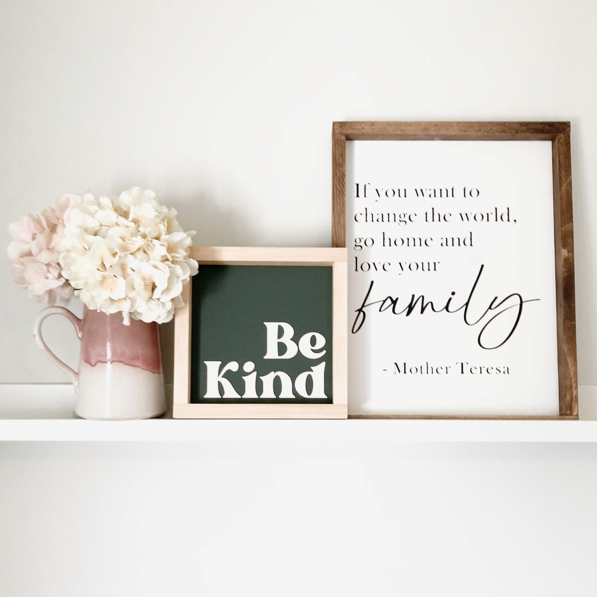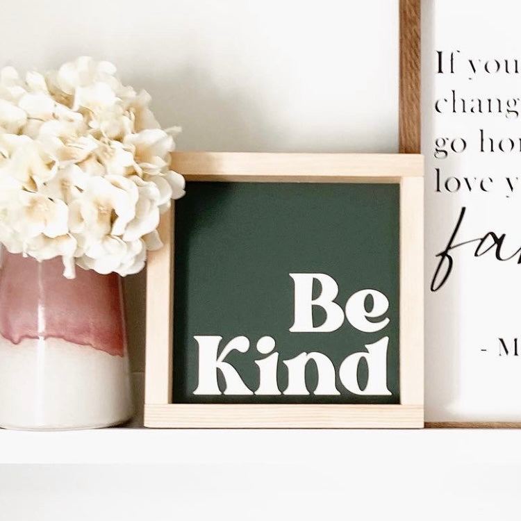 The Be Kind modern farmhouse sign is a beautiful addition to any shelf décor in your home or office. The 12x12 size is perfect for displaying on your wall.