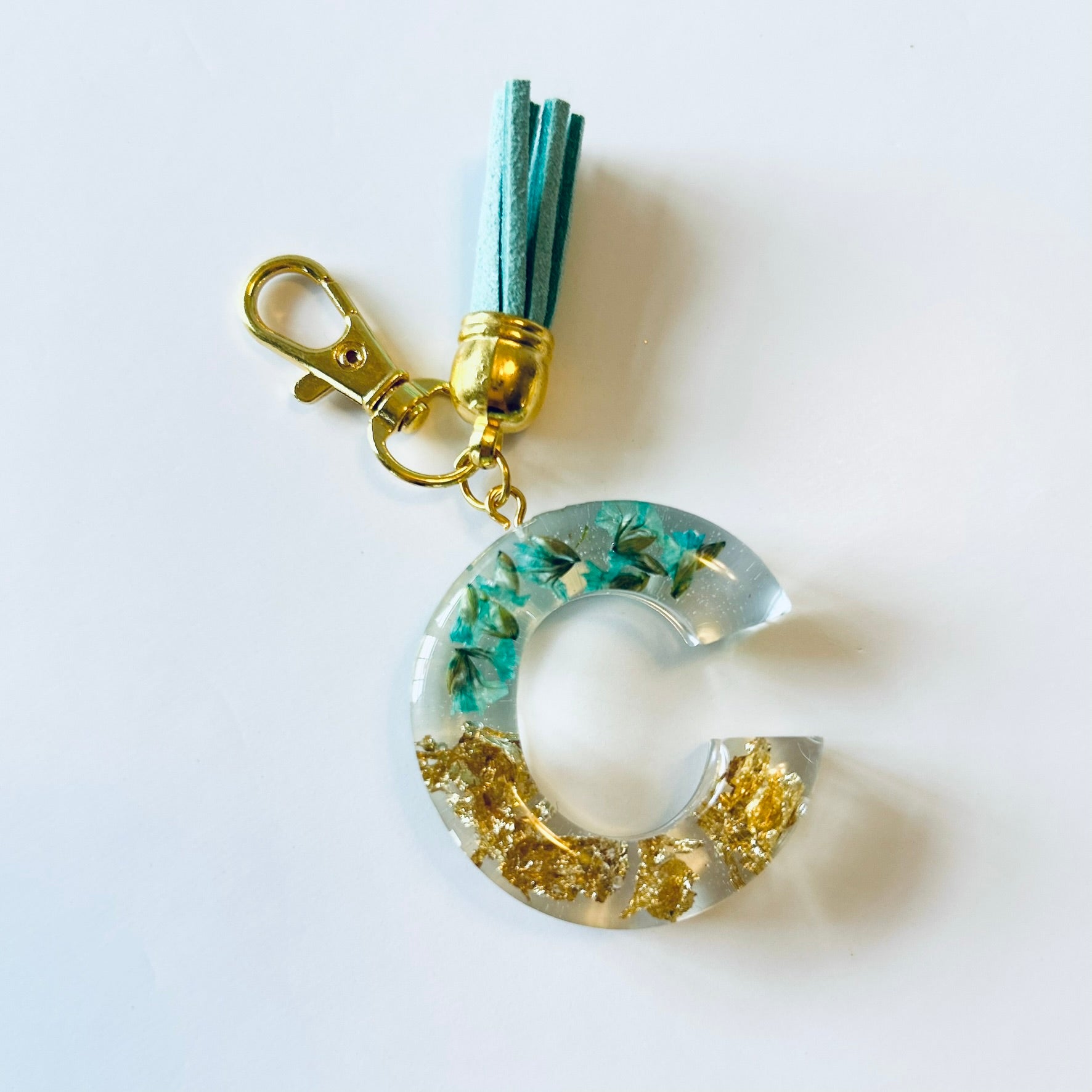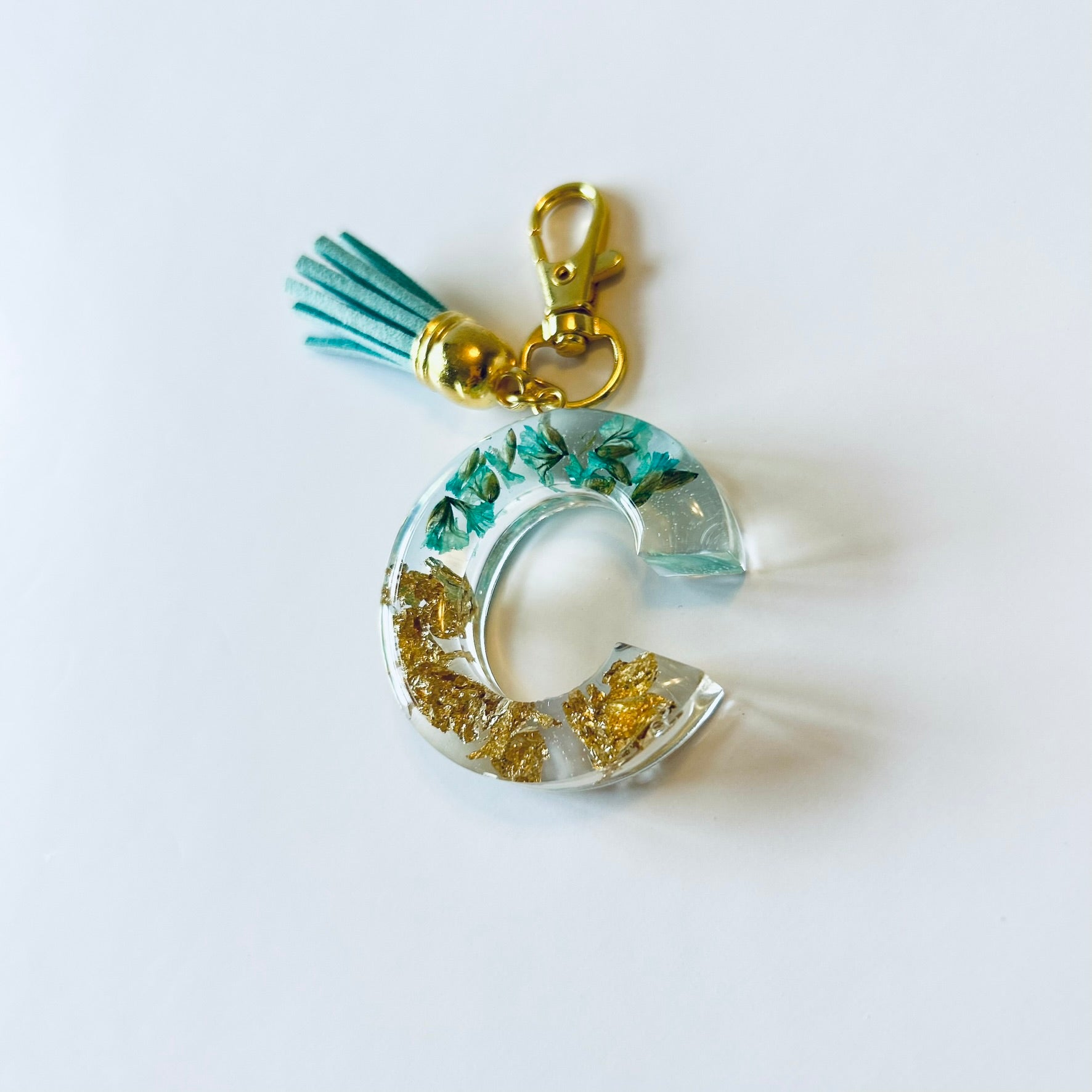 Resin keychain letter "C" in gold flakes and blue florals. Completed with gold hardware. The keychain shown is the keychain that will be shipped.