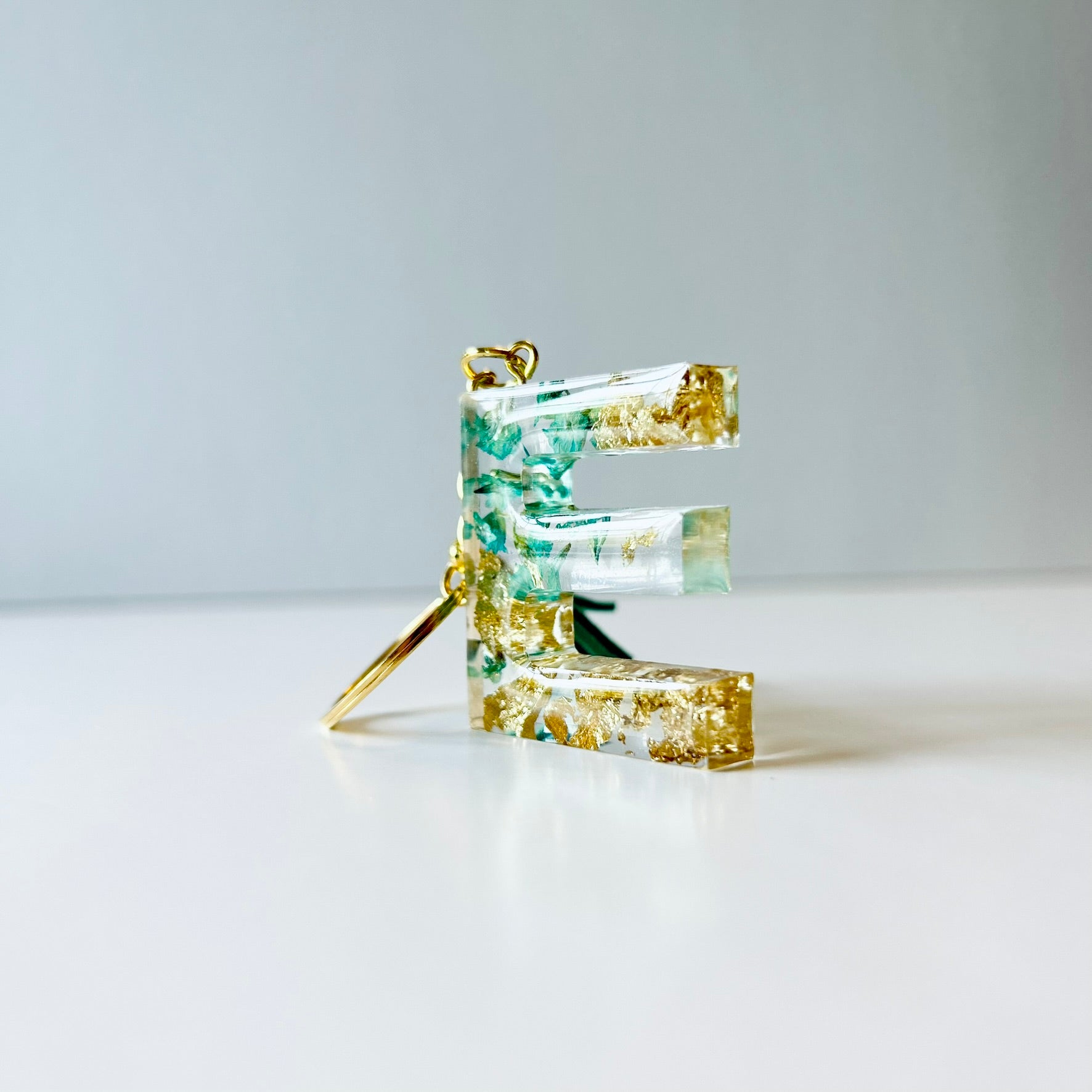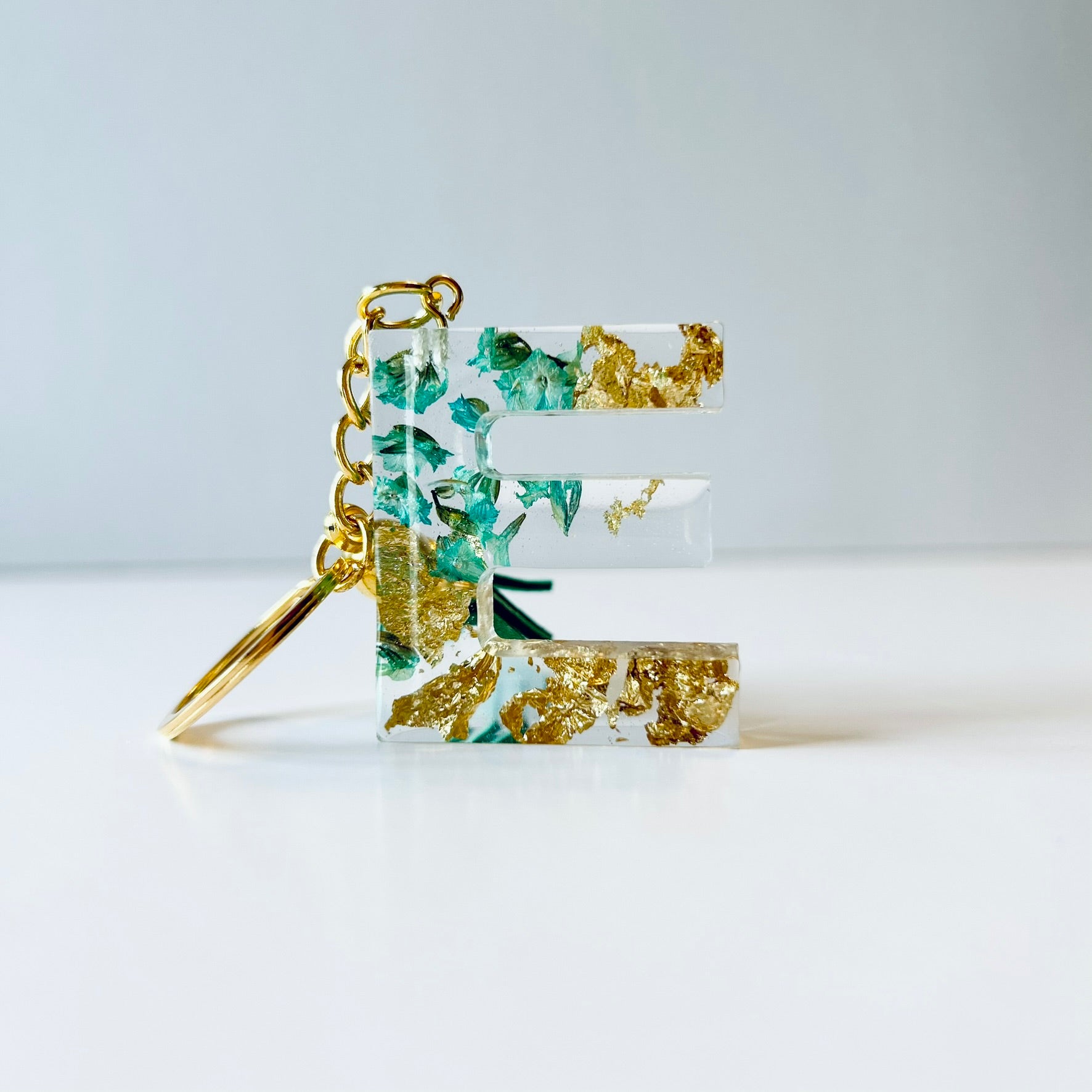 Resin keychain letter "E" in gold flakes and blue florals. Completed with gold hardware. The keychain shown is the keychain that will be shipped.