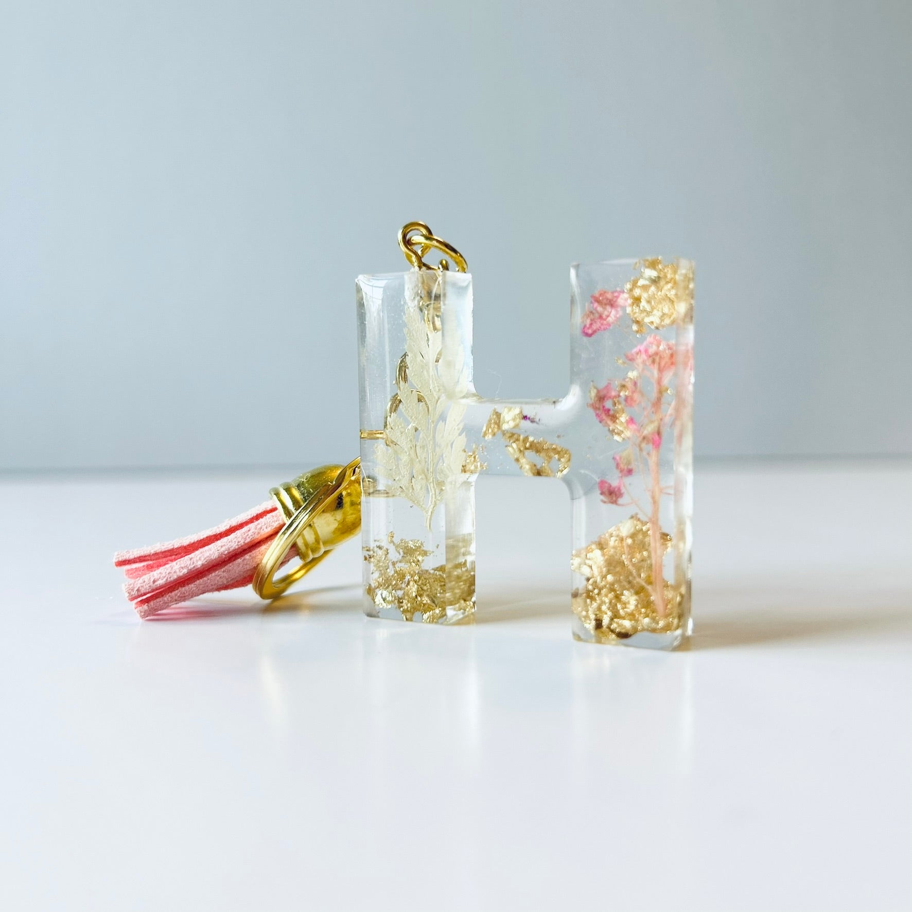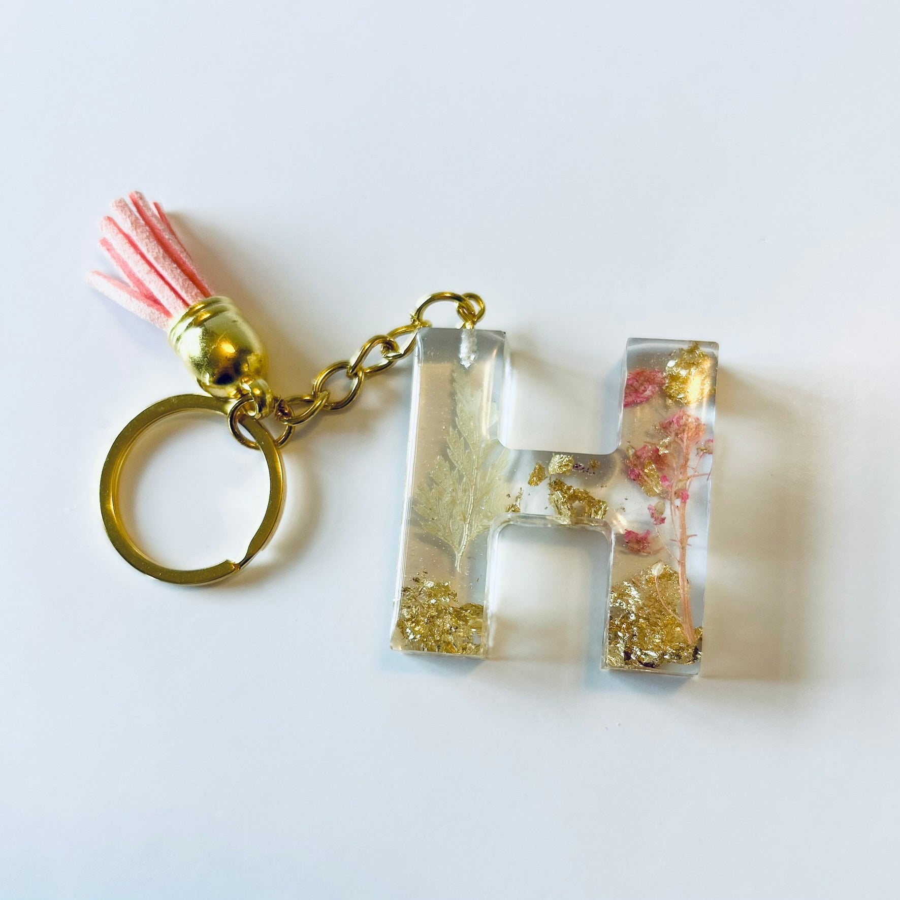 Resin keychain letter "H" in gold flakes, white and pink florals. Completed with gold hardware. The keychain shown is the keychain that will be shipped.