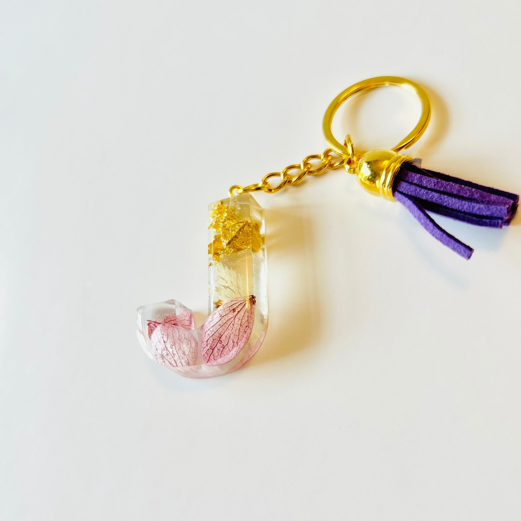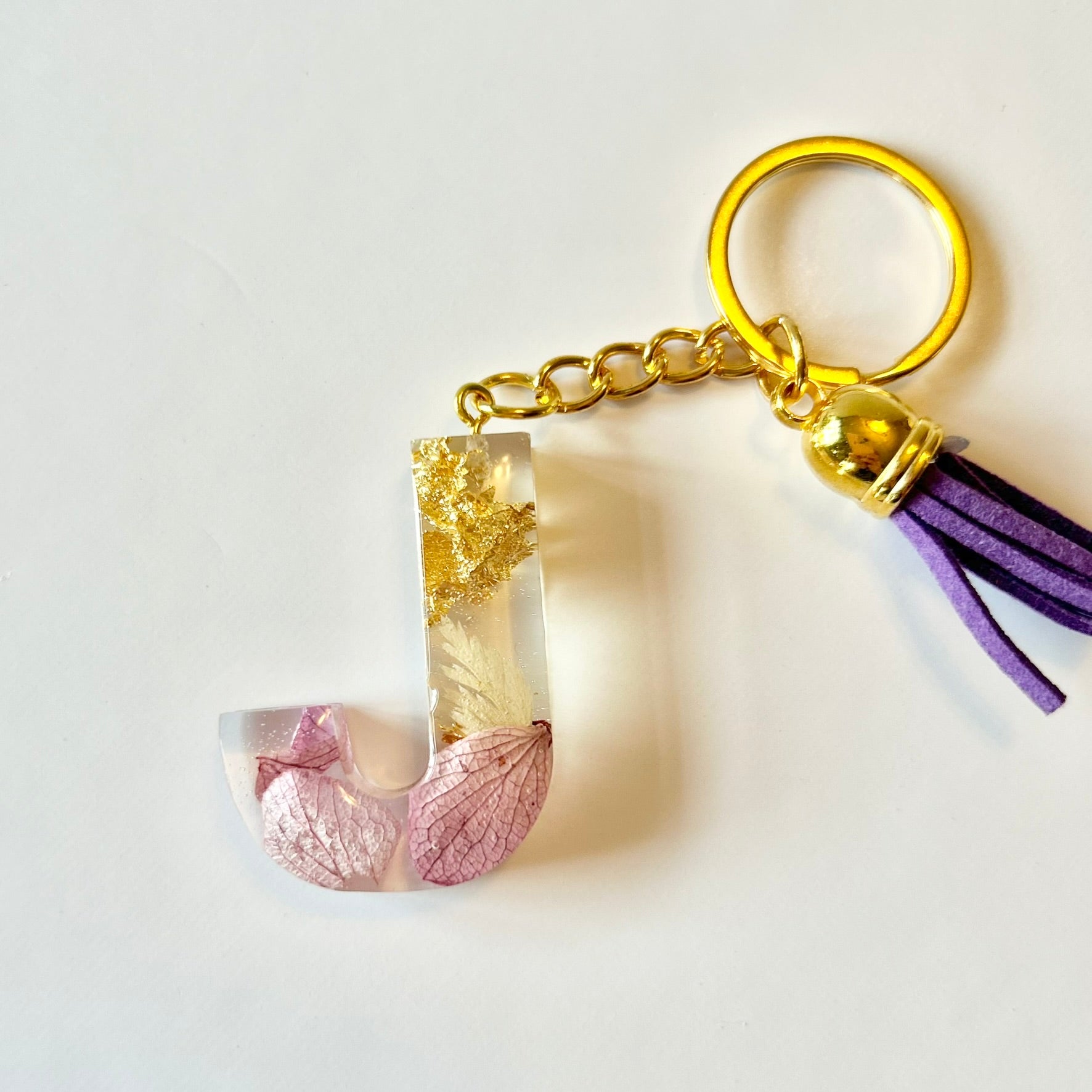 Resin keychain letter "J" in gold flakes and light purple florals. Completed with gold hardware. The keychain shown is the keychain that will be shipped.