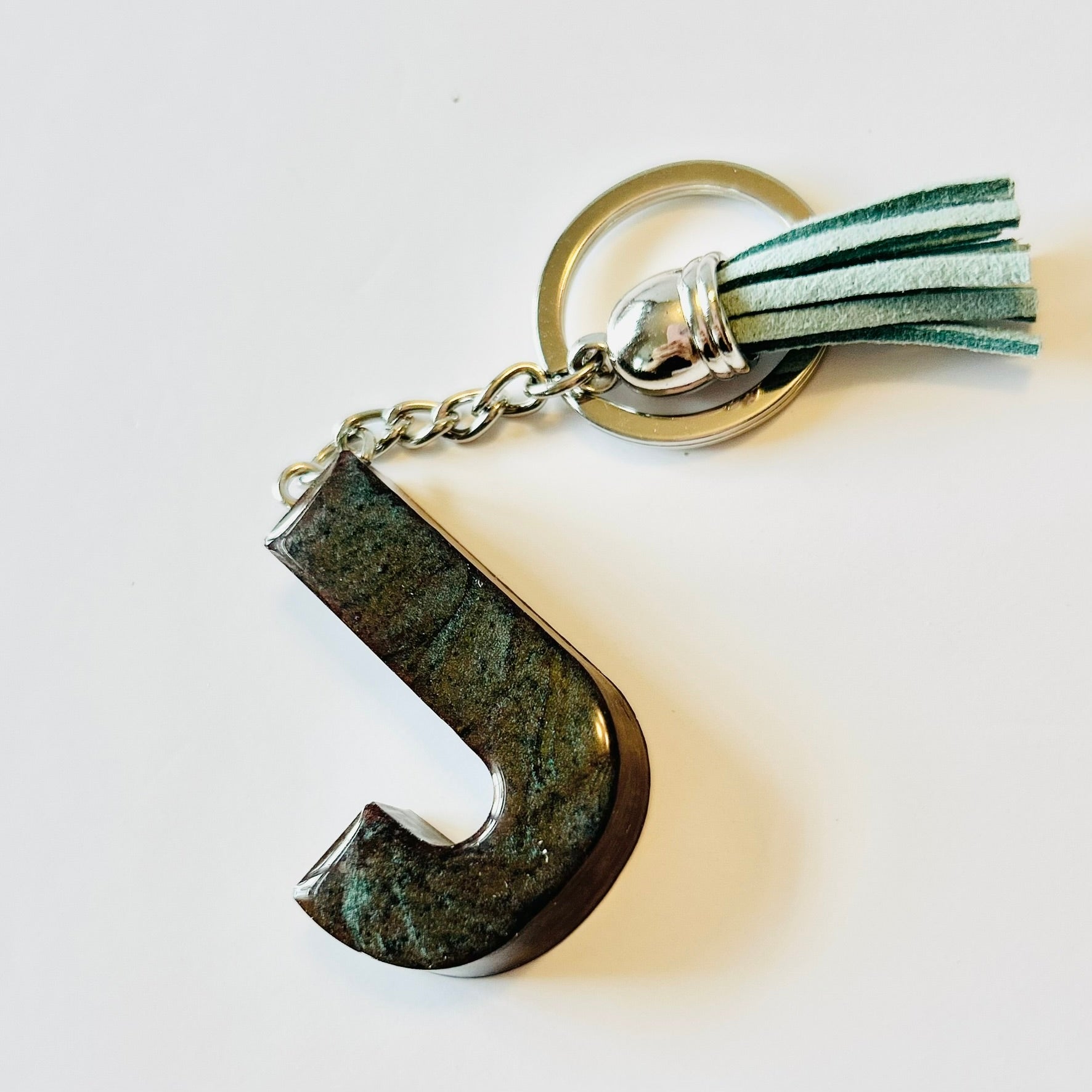 Resin keychain letter "J" in metallic coffee-green. Completed with gold hardware. The keychain shown is the keychain that will be shipped.