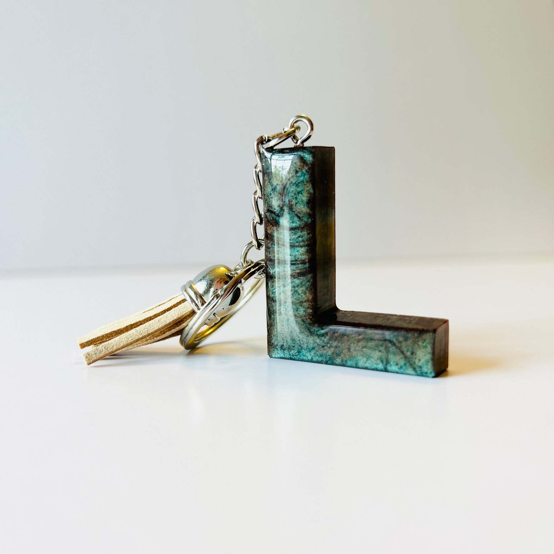 Resin keychain letter "L" in metallic coffee-green. Completed with silver hardware. The keychain shown is the keychain that will be shipped.