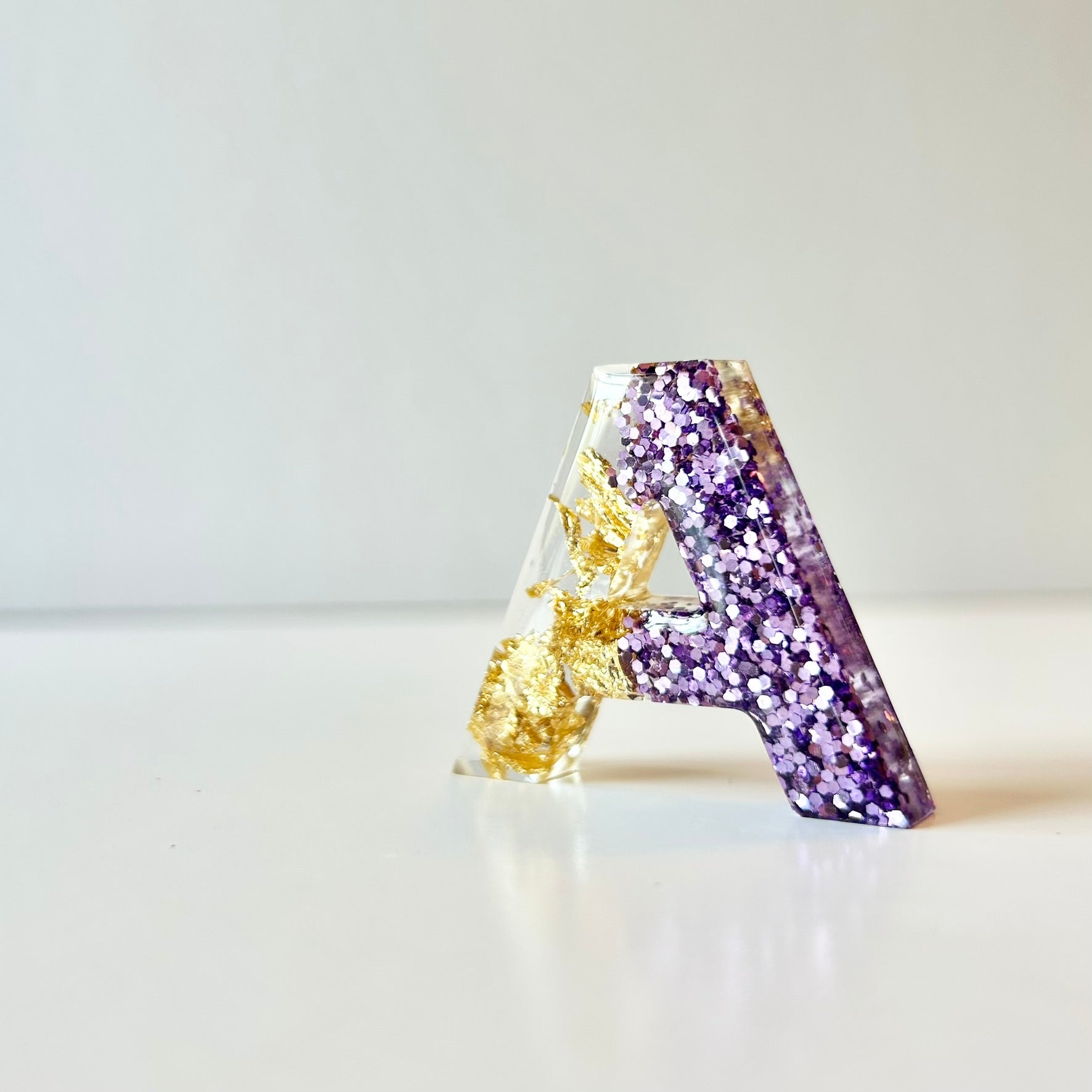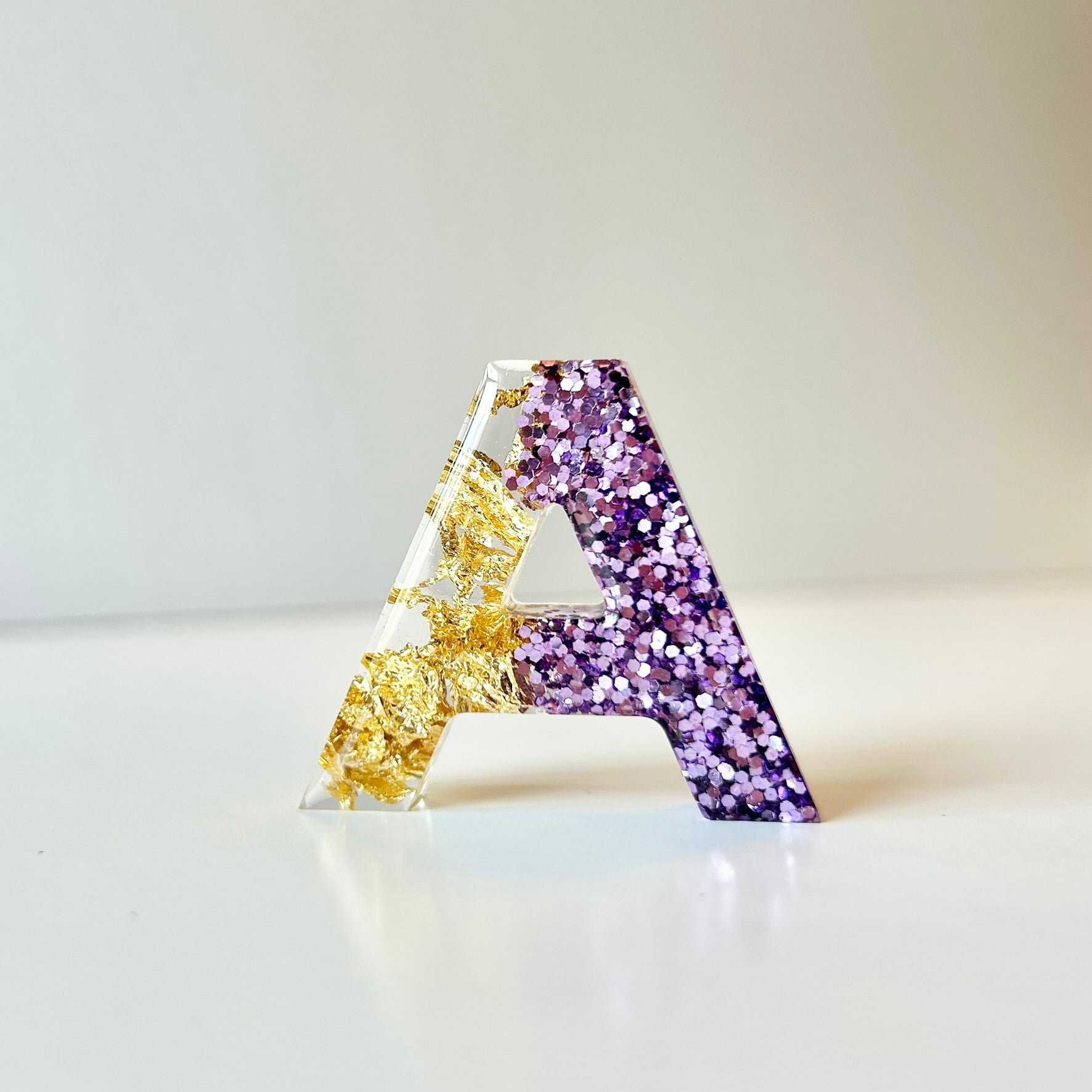 Resin Letter Magnet "A" in gold flakes and lavender purple glitter